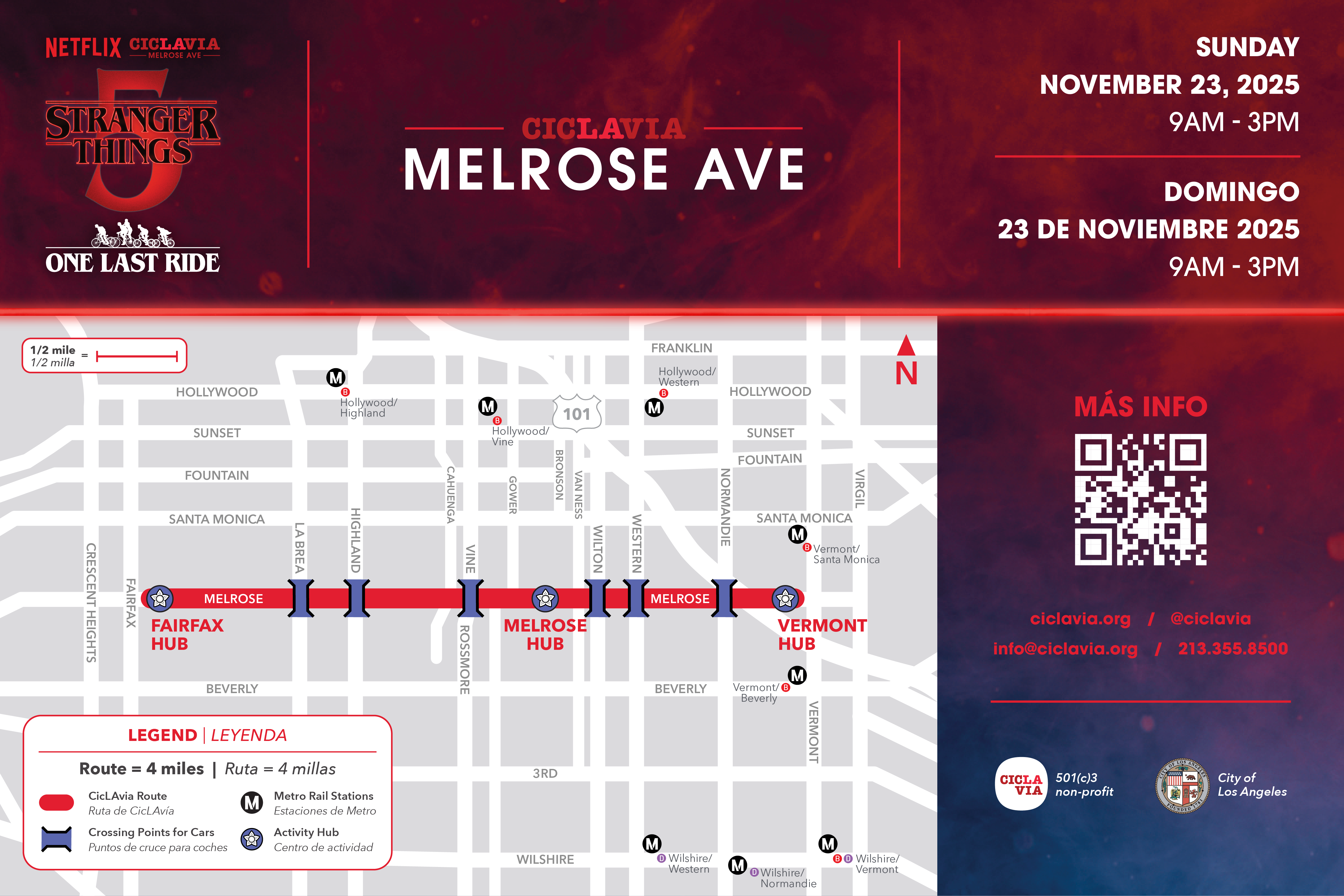Enjoy the pop-up park for the day in your favorite people-powered way, whether that’s walking, jogging, biking, roller skating, skating, or simply spectating! All ages and abilities are welcome. Be sure to join our email list so you don’t miss any event news and updates. Use the CicLAvia interactive digital map to plan which businesses, local gems, activities along the route, and Hubs to check out during the event on November 23! For more detailed information, visit the Netflix Tudum Stranger Things page!